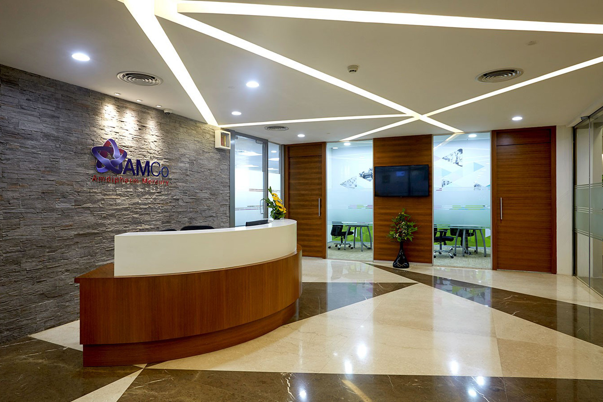 With 50,000 Sq. Ft. of space, AMCO’s office space was designed with their logo and brand colours as the foundation. We tried to enhance the values that go into the nitty-gritties of daily official work- passion, integrity, teamwork and focus. Some would think a pharmaceutical company is home to a dull atmosphere but with the additions of collaborative work spaces and greenery, “dull” is the last thing the AMCO space feels like.