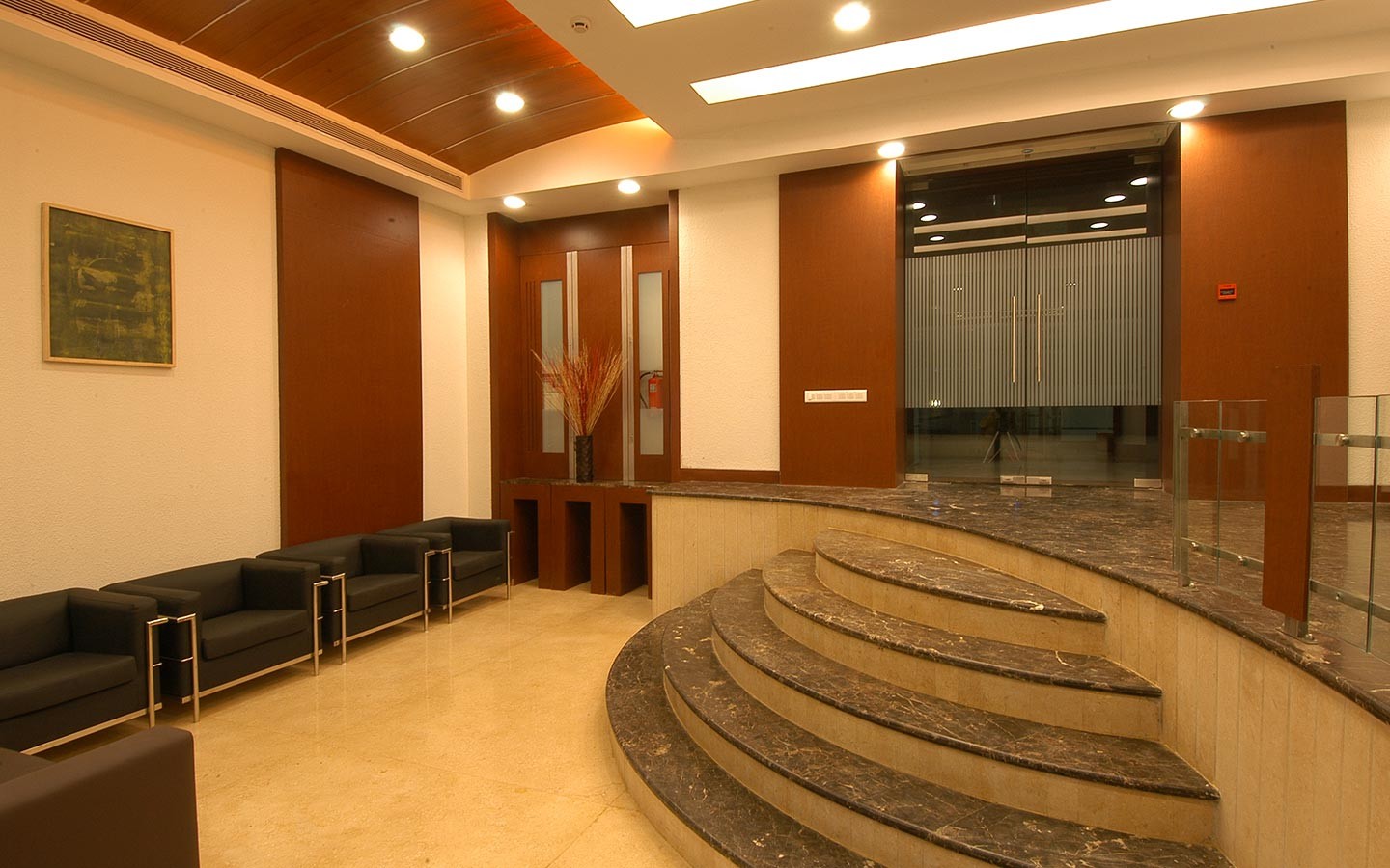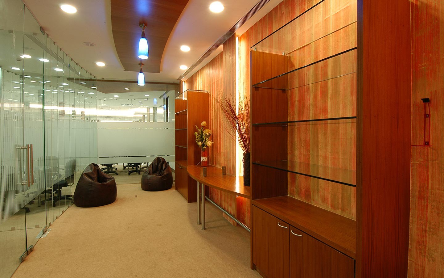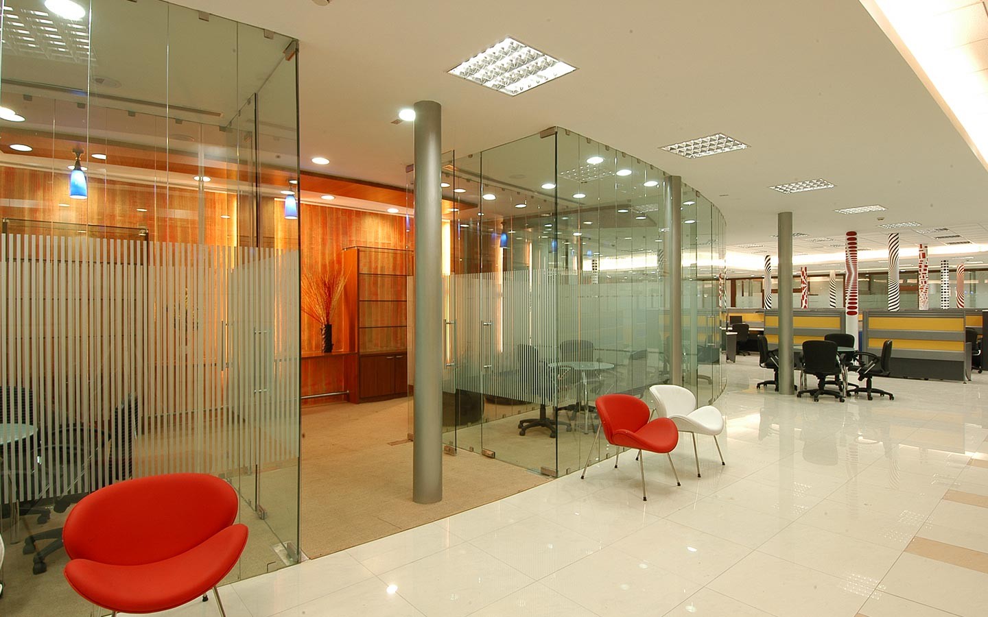 One of our personal favourites, this office space was given innovative styles with wood, graphics and colours. We had 220 columns to play with, and play we did with intensified graphics and artwork. The reception area was uniquely designed with shapely cuts along the water curtain in the passage.
