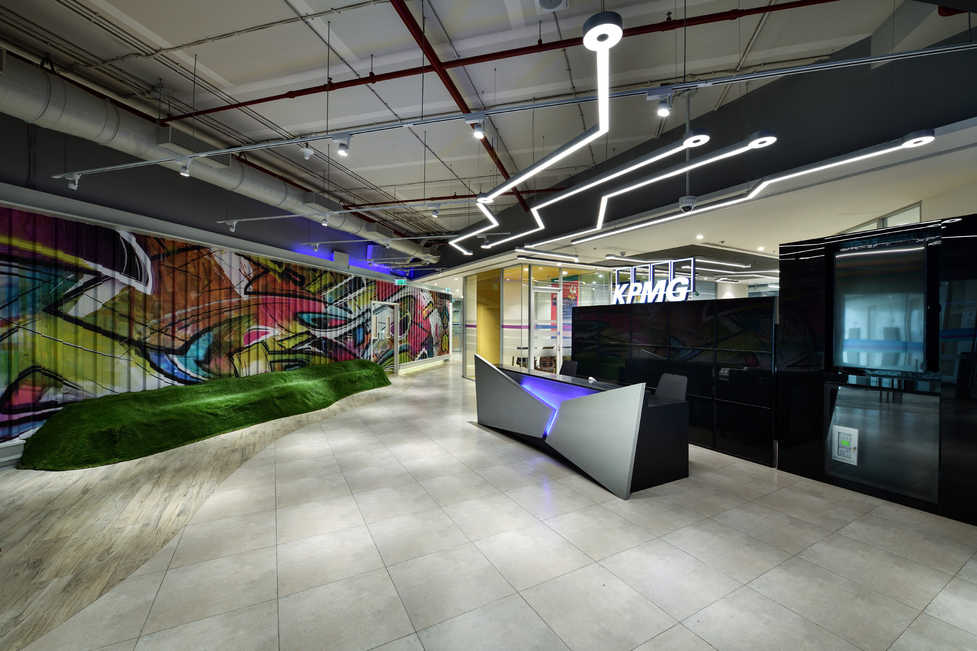 KPMG is a renowned finance, business, tax & regulatory advisor and service provider. This office is a place where work and play seamlessly merge together. We were asked to design a youthful and energetic office. The “Out of the Box Thinking” ideology was adopted by creating vivid and joyful concepts for various spaces within the office! We designed spaces with themes related to sports, which would uplift the team spirit and bring the members closer.