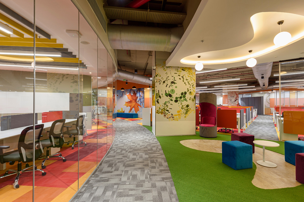 One of India’s fastest growing private sector banks with an ever expanding presence across the country, we had the opportunity to design its headquarters in Airoli, Navi Mumbai. The space was divided into four quarters as per seasons namely Spring, Summer, Autumn and Winter, with associated colours splashed across the floor, walls and ceiling thus creating interesting textures and patterns.