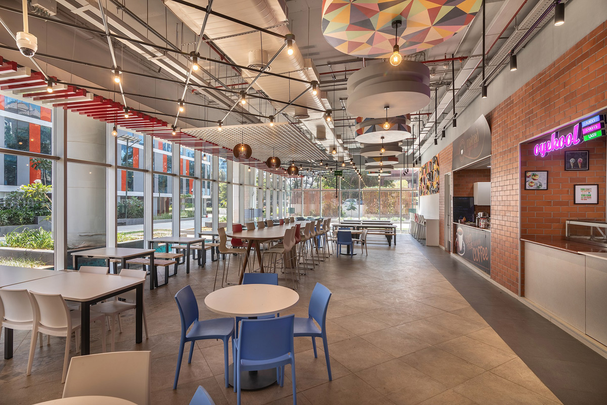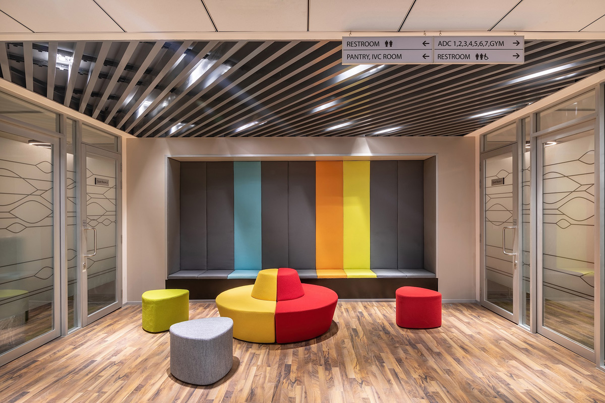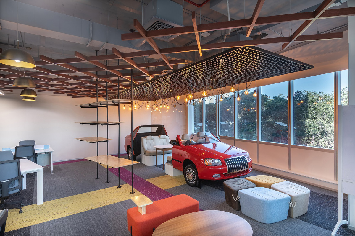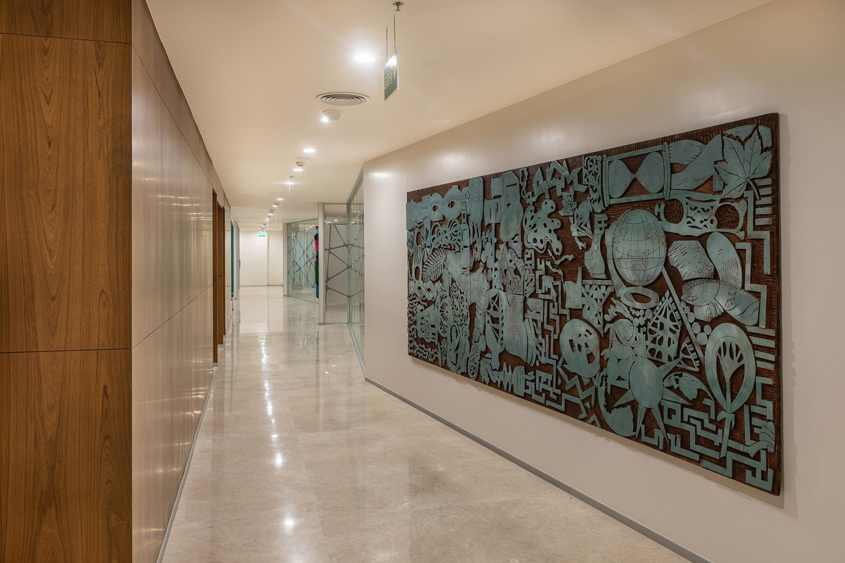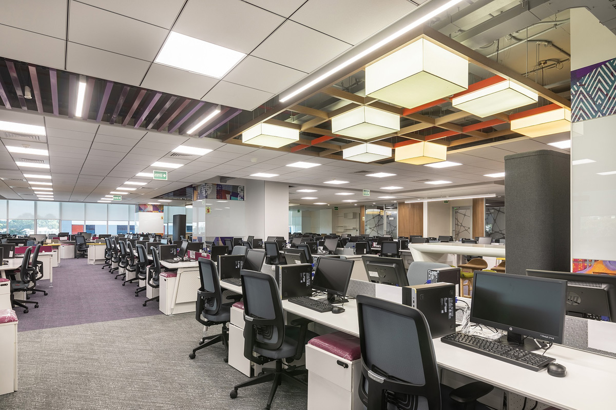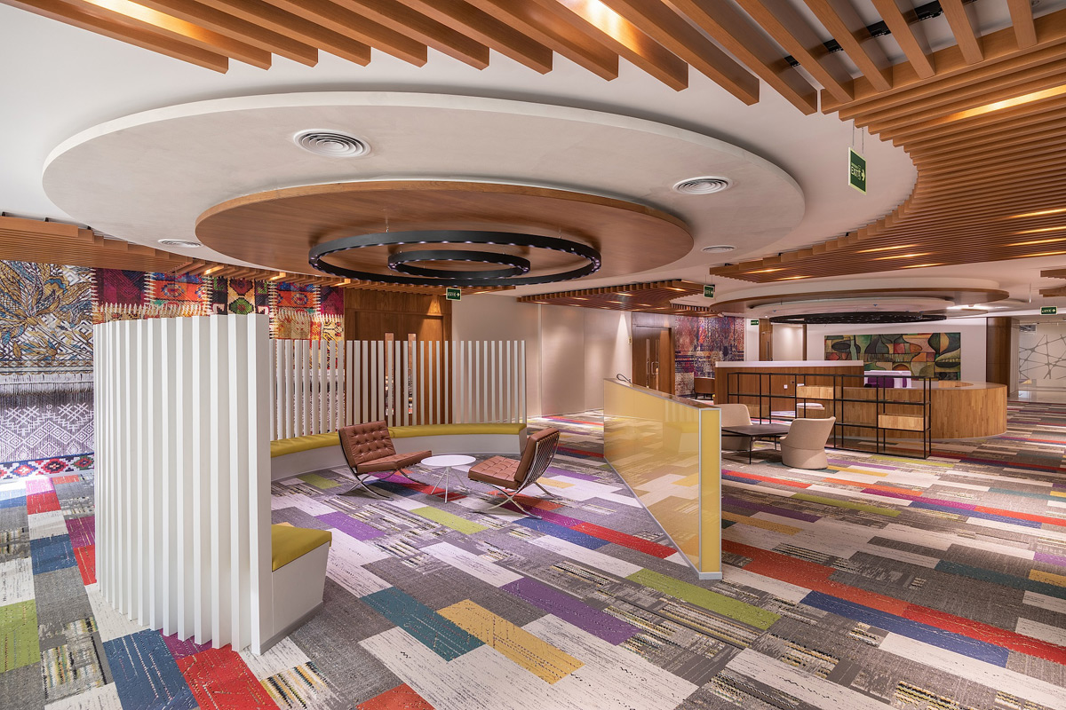 Headquartered in Mumbai, TCS is an Indian multinational information technology services and consulting company operating across 46 countries. The building structurally consisted of two basements, a ground floor and 12 upper floors. We had to match the grandeur of TCS by the way we designed its office. Double heighted ceilings were an added bonus giving us a lot of opportunities and leeway to experiment with different shapes, forms and materials.The use of wood, metal, stone, modular and loose furniture imparts an exquisite vibe to the atmosphere.